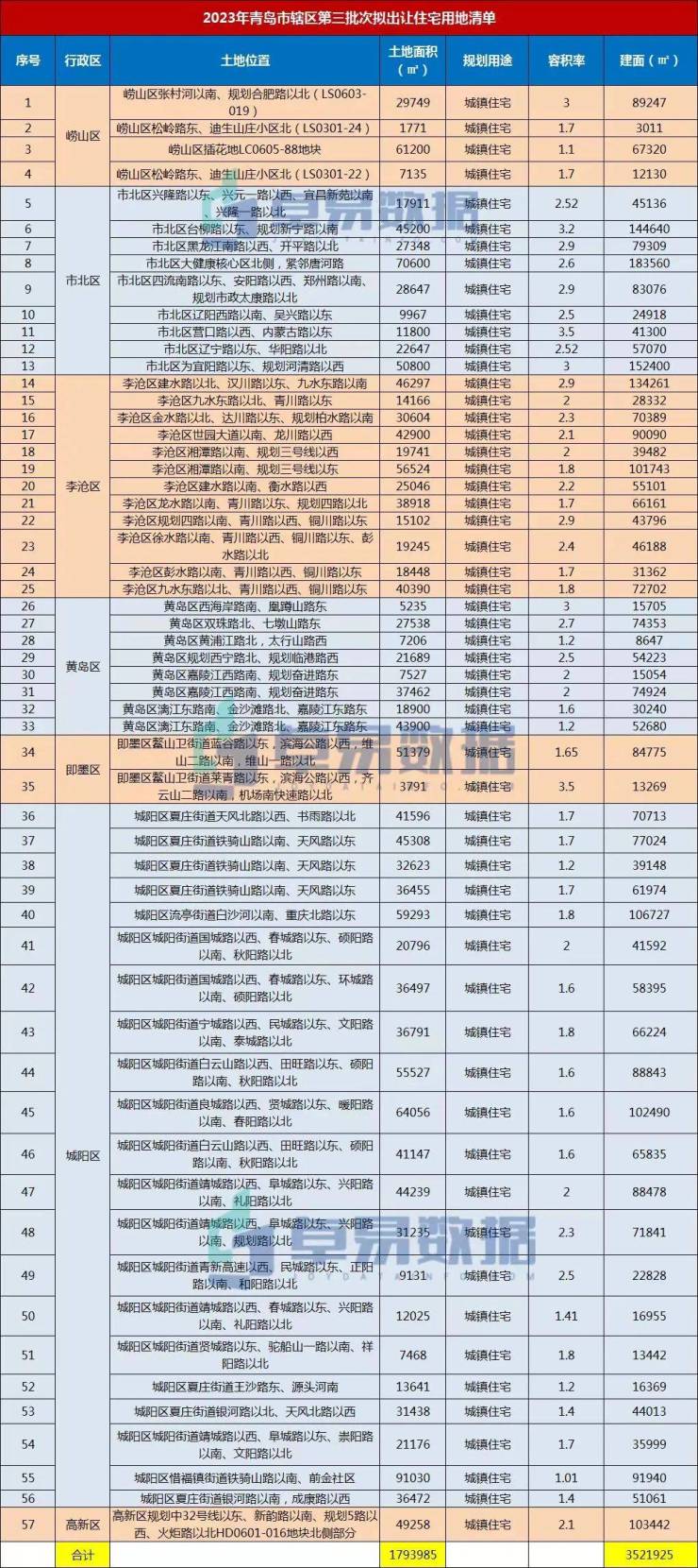 第三批次住宅用地拟出让清单发布预告,57宗地占地面积约179万㎡,总建筑面积约352万㎡,已经挂牌23宗(中止1宗),成交22宗,流拍2宗。