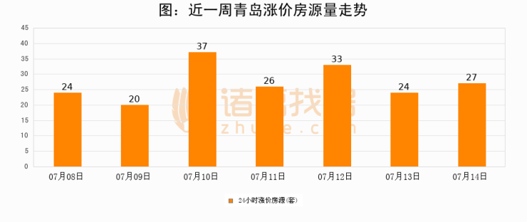 根据诸葛找房数据显示,青岛24小时涨价房源量为27套,较07月13日增加3套,环比上涨12.5%。与此同时,涨价房源占比小幅扩大,业主信心有所提升。
