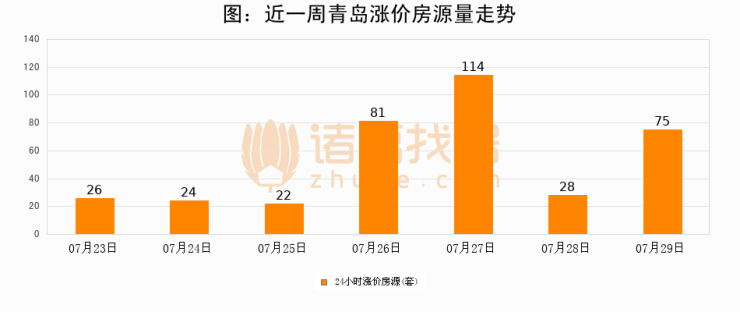 根据诸葛找房数据显示,青岛24小时涨价房源量为75套,较07月28日增加47套,环比上涨167.9%。与此同时,涨价房源占比小幅扩大,业主信心有所提升。