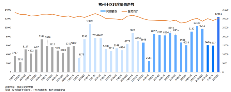 杭州贝壳研究院统计数据显示,3月份,杭州市区二手房累计网签12413套,成交量较2月的5977套增长108%,同比增长45%;成交均价为30210元/平方米,环比微增4%。3月二手房成交套数,也创下杭州近8年新高。