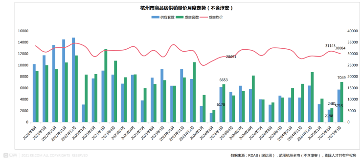 杭州贝壳研究院统计显示,今年3月,杭州市区新建商品房成交7049套,环比增长184%;二手房成交12413套,环比增长108%,同比增长45%,成交量创下近8年新高。