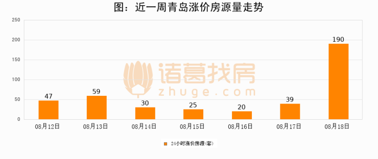 根据诸葛找房数据显示,青岛24小时涨价房源量为190套,较08月17日增加151套,环比上涨387.2%。与此同时,涨价房源占比小幅扩大,业主信心有所提升。