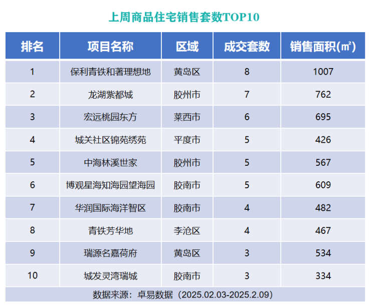 从各项目成交套数来看,位于西海岸新区的保利青铁和著理想地以成交8套的成绩列榜单首位;位于胶州市的龙湖紫都城以成交7成绩上榜第二位;位于莱西市的宏远桃园东方以成交6套的成绩列榜单第三位。