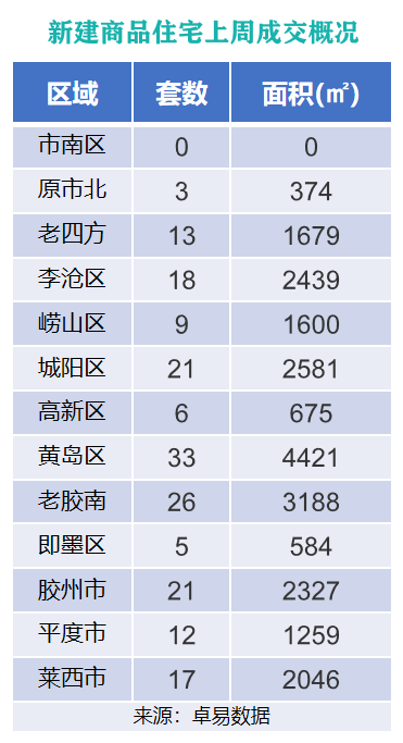 从各区成交情况来看,上周原黄岛区新建商品住宅以成交面积4421㎡的成绩,位列上周各片区新建商品住宅成交面积榜首位;原胶南市以成交面积3188㎡的成绩,位列成交面积榜第二位;城阳区以成交面积2581㎡的成绩,位列成交面积榜第三位。