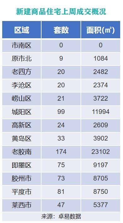 从各区成交情况来看,上周原胶南市新建商品住宅以成交174套,成交面积23102㎡的成绩,位列上周各片区新建商品住宅成交面积和成交套数榜首位;城阳区以成交99套,成交面积11994㎡的成绩,位列成交面积榜第二位。