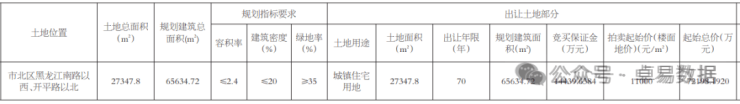 地块位于市北区黑龙江南路以西、开平路以北,占地27347.8㎡,容积率2.4,建面65634.72㎡,建筑密度≤20%。绿地率≥35%,楼面起拍价11000元/㎡,起拍总价7.2亿。