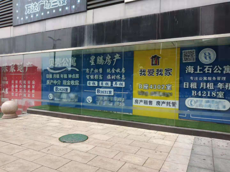 万达广场商务楼下,还有各家公寓和中介的广告宣传。经过了解,万达广场楼上的公寓工作日日租在300元左右,一日一价,且周末价格会再涨。