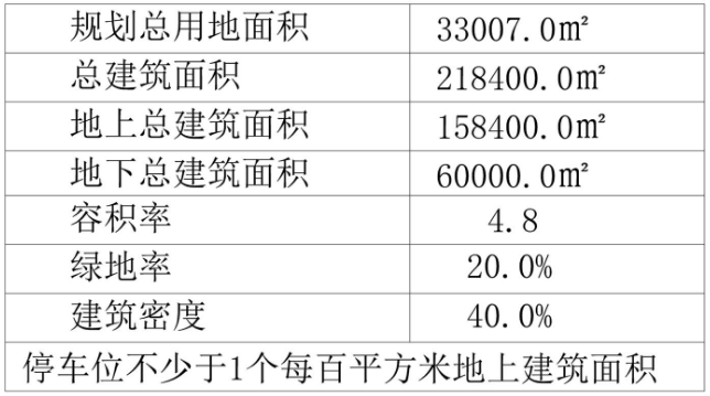 根据公布的规划显示,该地块规划总用地面积33007.0平方米,总建筑面积218400.0平方米,地上总建筑面积158400.0平方米,地下总建筑面积60000.0平方米,容积率4.8,绿地率20.0%,建筑密度40.0%,停车位不少于1个每百平方米地上建筑面积。