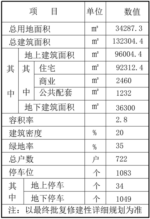 根据公布的规划显示,该地块总用地面积34287.3平方米,总建筑面积132304.4平方米,其中地上建筑面积96004.4平方米,包括住宅92312.4平方米、商业2460平方米、公共配套1232平方米,地下建筑面积36300平方米;容积率2.8,建筑密度20%,绿地率35%,总722户,停车位1083个,其中,地上停车场34个,地下停车1049个。以最终批复修建性详细规划为准。