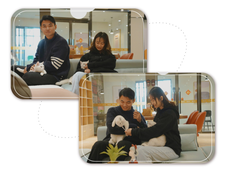 撸双份的猫,得双份的快乐!因为工作原因,租户樊益崭经常出差,同为铲屎官的运营官刘文靖便会主动帮忙照顾汤圆。“因为都是猫友,我俩总有聊不完的话题。我出差的时候她不但帮我细心地照顾汤圆,还经常送些汤圆喜欢的零食,有时周末也会带着圈圈来和汤圆玩,和老朋友一样贴心。”