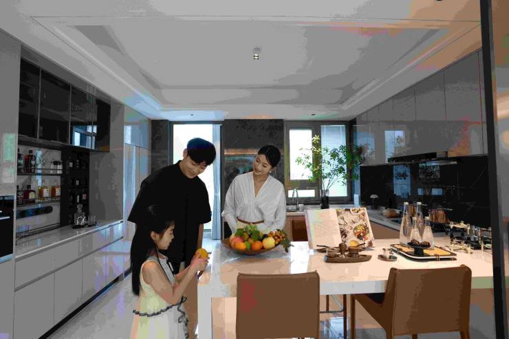 样板间延续云庐系的庐境美学基因,光幕式的建筑,隐梁隐柱设计,使得建筑轻盈灵动,犹如漂浮在山海上空的一片云。下叠样板间建面约212-224㎡,宽幕格局尺度,实现最大约187%得房率,270°寰幕观景阳台、南向阳光庭院,将山海景致引入生活动线。室内皮革、金属与艺术大理石碰撞,定制的家具与元素壁画,诠释新奢生活的优雅张力。