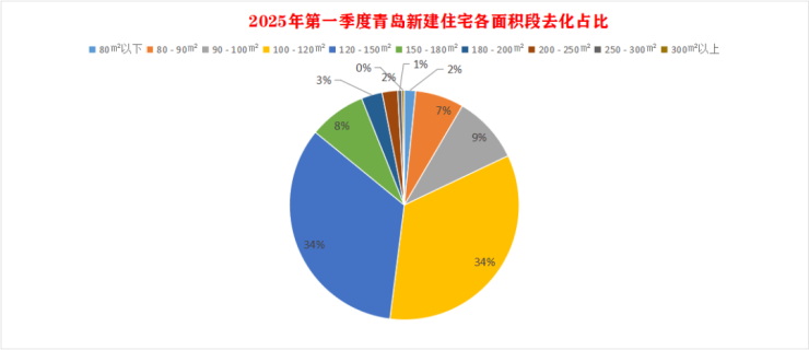 2025年 Q1在全市的商品住宅去化中,从需求结构来看,100㎡以下的占比18%,120-150㎡面积段成交最多占比34.05%,与100-120㎡两个面积段加起来合计约68%.