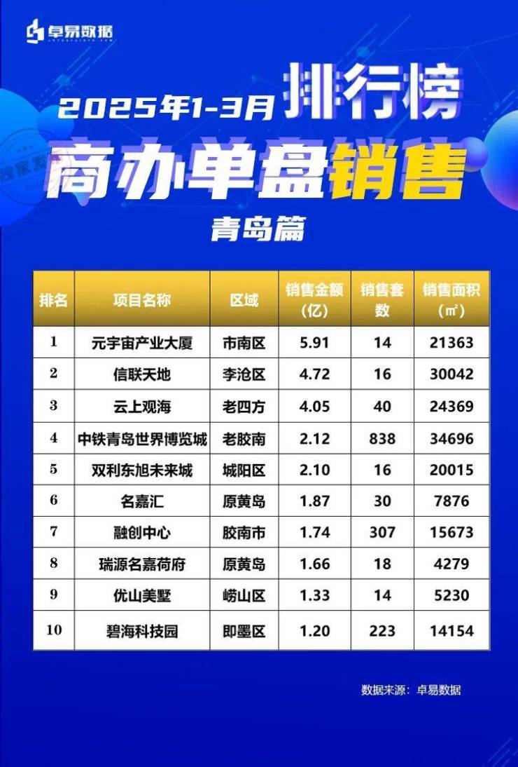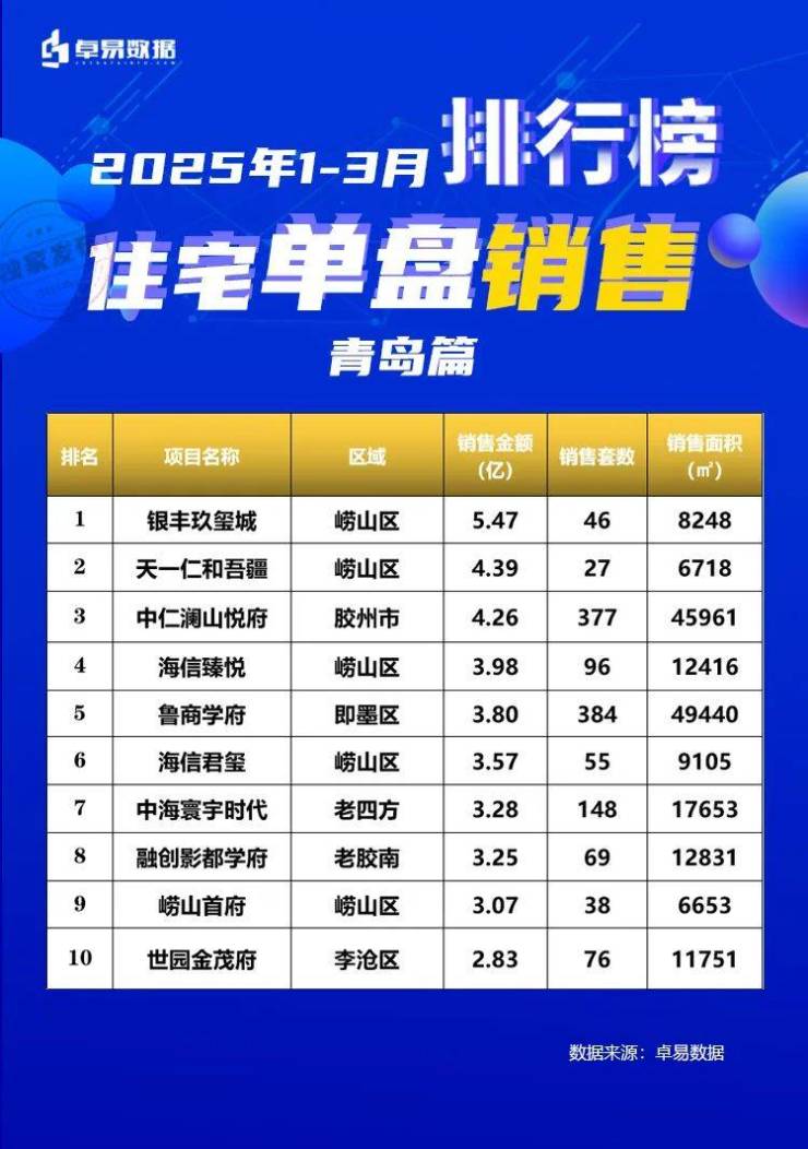 城阳区(含高新区)成交3283套,其中双利东旭未来城2.62亿、中巍白云山居2.53亿、青特滨湖国际2.49亿、金茂中欧国际城2.12亿(以213套获得套数销冠,3月单月认购超100套)、鲁昊棠琳湾1.95亿。