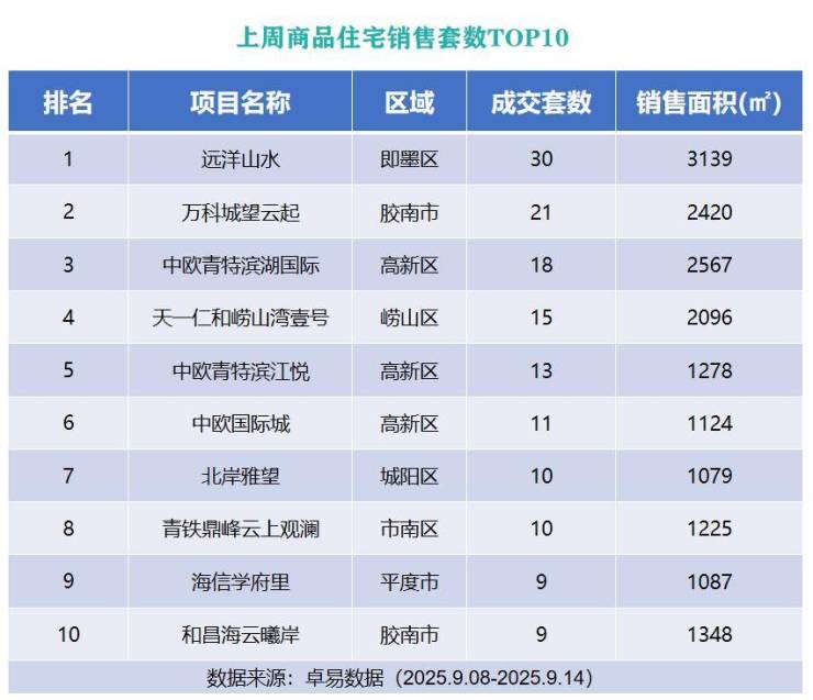 从各项目成交套数来看,位于即墨区的远洋山水以成交30套的成绩列榜单首位;位于西海岸新区的万科城望云起以成交21套成绩上榜第二位;位于高新区的中欧青特滨湖国际以成交18套的成绩列榜单第三位。