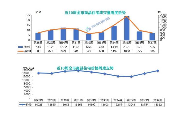 价格方面,上周青岛新建商品住宅均价为15332元/㎡,上涨1578元/㎡,涨幅为11.47%。