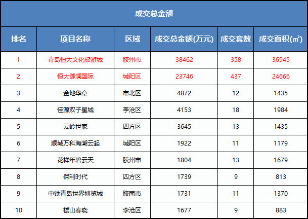 除了恒大项目外,成交总金额较高的金地华章成交12套;次之的佳源双子星城成交18套;榜单前十的“守门线”项目楼山春晓成交9套。
