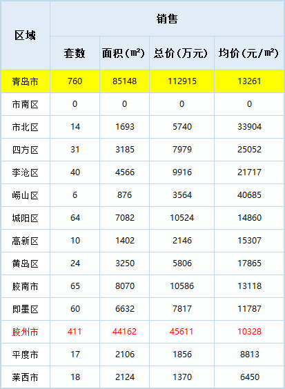 根据卓易数据统计,今年十一黄金周期间,青岛新建商品住宅成交760套,与同比上涨0.4%;成交面积85148㎡,同比下降5.97%;成交均价13261元/㎡,同比下降6.56%。