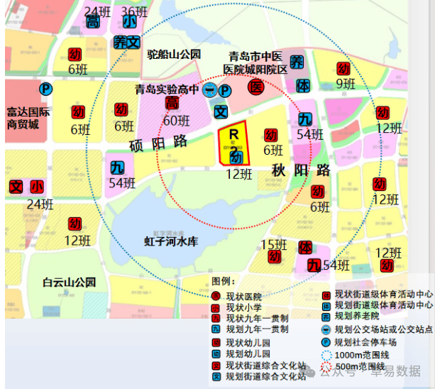 教育与医疗:地块北侧为现状青岛实验高中,东南侧有现状九年一贯制学校,地块东侧、西侧各有一处规划九年一贯制学校,地块内配建12班幼儿园;地块东北侧有在建青岛市中医医院城阳院区和规划养老院。