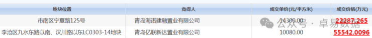 青岛海诺建融置业有限公司(平台)获得宁夏路125号地块,楼板价14300元/㎡,成交总价2.23亿;