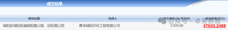 竞得人:青岛城阳开投工程有限公司 ,楼板价5709元/㎡,成交总价4.78亿。
