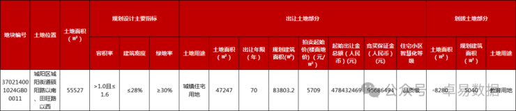 地块位于城阳区城阳街道硕阳路以南、田旺路以西,占地面积55527㎡,容积率1.6,建筑面积约83803.2㎡,此外还有5040㎡教育用地,起拍楼面地价5709元/㎡,起拍总价4.78亿元,竞买保证金9567万元。