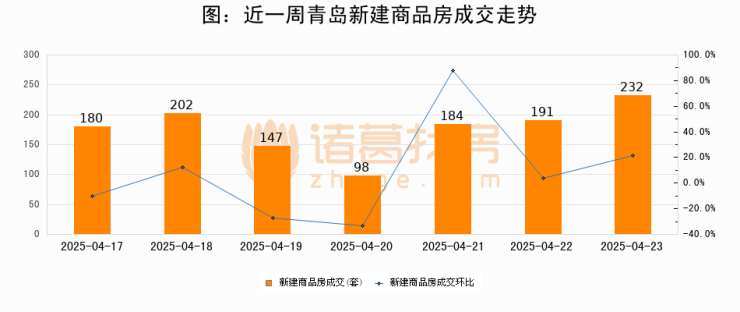 根据青岛市住房和城乡建设局数据显示,2025年04月23日青岛新建商品房成交232套,较昨日增加41套,环比上涨21.5%