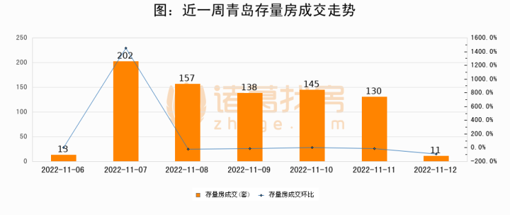 从存量房来看,2022年11月12日青岛存量房单日成交11套,比昨日减少119套,环比下降91.5%。从近一周存量房成交来看,青岛存量房日均成交套数为113套,其中11月07日成交量最高为202套,11月12日单日成交11套,低于近一周平均水平90.3%。