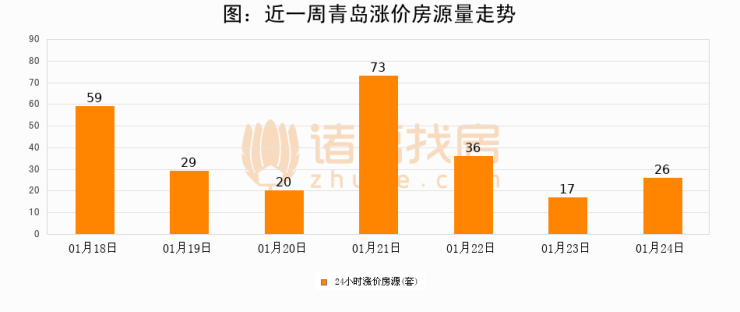 根据诸葛找房数据显示,青岛24小时涨价房源量为26套,较01月23日增加9套,环比上涨52.9%。与此同时,涨价房源占比小幅扩大,业主信心有所提升。
