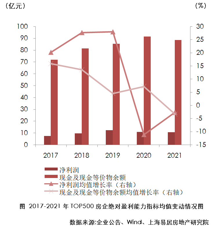 根据测评研究报告,2021年TOP500房地产开发企业总资产均值为916.78亿元,同比增长10.47%,增速较上年下降6.17个百分点;净资产均值为211.93亿元,同比增长18.52%,增速较上年提升0.63个百分点。总体来看,TOP500房企总资产规模维持增长,增速连续四年下降。净资产同样保持增长,增速近三年保持稳定。