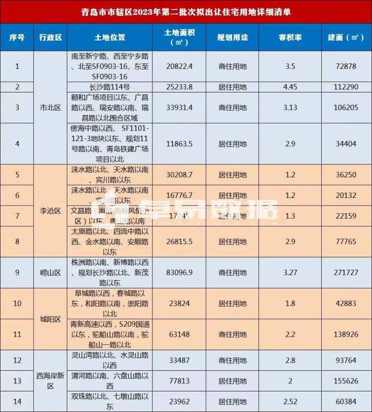 2023年青岛二批次用地(14宗,占地面积约48.8万㎡,总建筑面积约124.54万㎡),此前已经挂牌3宗,分别为城阳小北曲地块(成交)、市北麦芽厂地块(成交)、李沧文昌路地块(流拍)。
