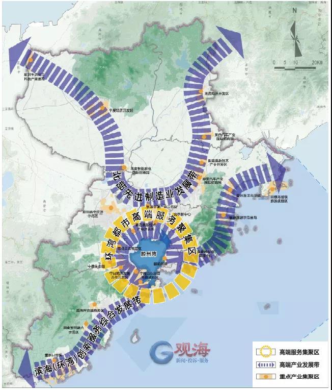 青岛要构建“一湾 两带 多区”的产业发展格局。“一湾”为环湾都市高端服务聚集区;“两带”为北部先进制造业发展带、滨海(环湾)创新服务综合发展带;“多区”为全市产业聚集区。