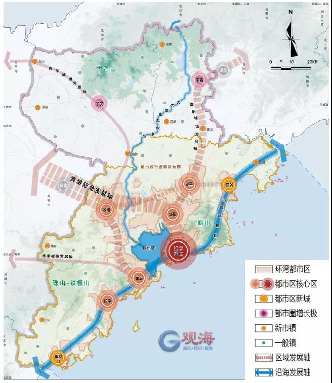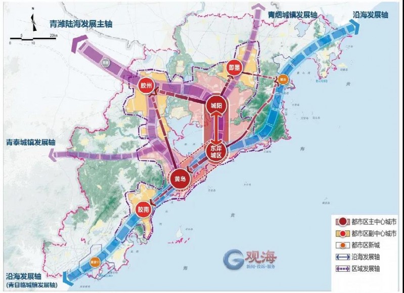 要打造“一区 两极五轴多点”的城镇发展格局。“一区”为环湾都市区,包括东岸(市南、市北、李沧、崂山)、城阳、原黄岛、原胶南、胶州、即墨、董家口港城、蓝谷海洋科学城等城市功能;“两极”为平度、莱西两个都市圈重要增长极;“五轴”为青潍陆海发展轴、沿海发展轴、青烟城镇发展轴、青东城镇发展轴、青泰城镇发展轴;“多点”为姜山、南村、新河、田横、店埠等重要的新市镇节点。