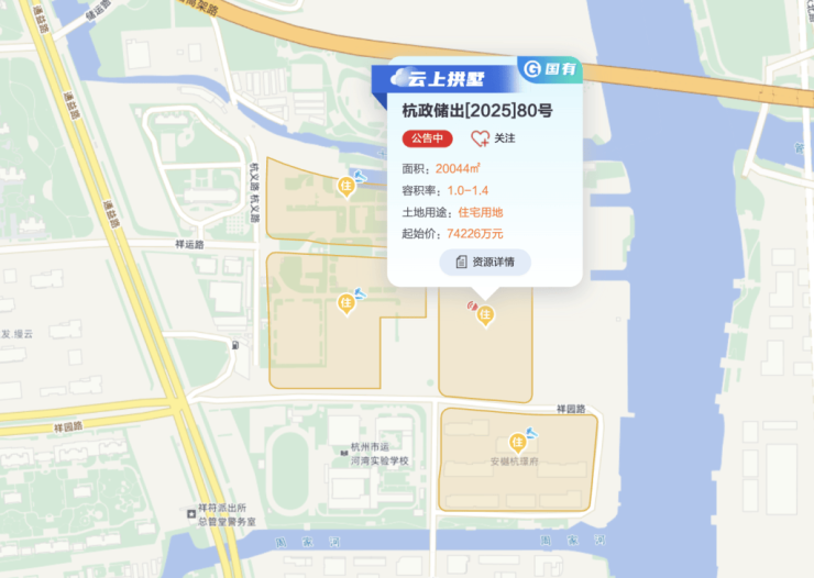 杭政储出[2025]80号即拱墅区原运河新城单元GS1004-09-2地块,东至规划支路二,南至祥园路,西至规划支路七,北至规划支路二。地块出让面积20044平方米,出让建筑面积28061.6平方米,出让起始价74226万元,折合起始楼面价约2.65元/平方米。