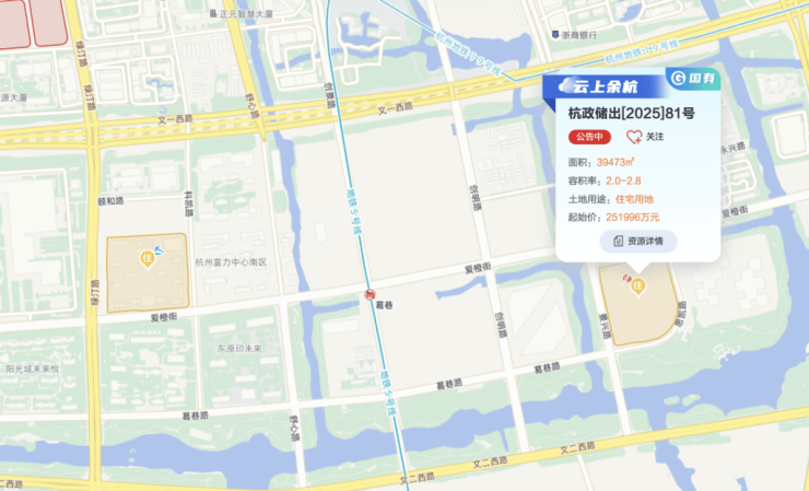 此次未来科技城单元也有地块出让。杭政储出[2025]81号即余杭区未来科技城单元YH090206-03地块,东、南至思凯路,西至景兴路,北至河道绿地。地块出让面积39473平方米,出让建筑面积110524.4平方米,出让起始价251996万元,折合起始楼面价2.28万元/平方米。
