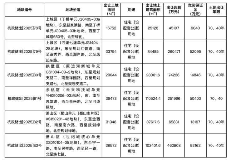 6宗地块中,起始总价及起始楼面价最高的地块为杭政储出[2025]83号地块,即萧山区世纪城核心单元XS010104-05地块,该地块东至宁一路,南至民祥路,西至经一路,北至纬七路。地块出让面积36572平方米,出让建筑面积102401.6平方米,出让起始价460808万元,折合起始楼面价4.5万元/平方米。