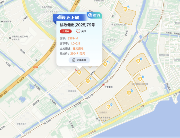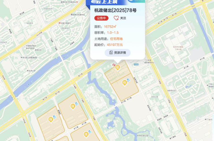此外,上城区丁桥单元地块也受到关注。杭政储出[2025]78号即上城区丁桥单元JG0405-03a地块,东至赵家浜路,南至丁桥单元JG0405-03b地块,西至丁城路550号,北至绿化。地块出让面积16752平方米,出让建筑面积25128平方米,出让起始价45197万元,折合起始楼面价约1.8万元/平方米。该地块距离3号线桃花湖公园站约700米,周边配套齐全。