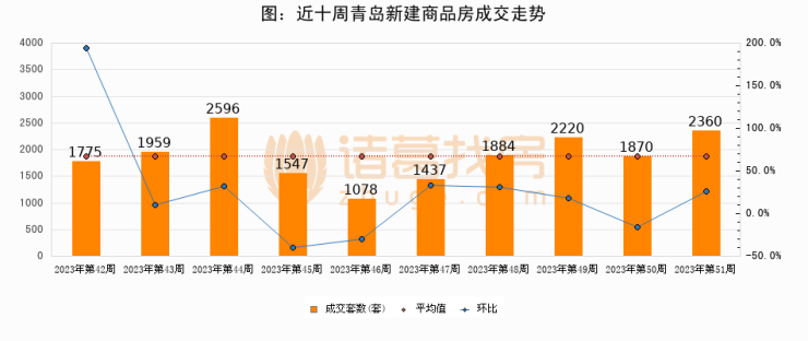 进入2023年第51周(12月11日-12月17日),青岛新建商品房成交2360套,较上周增加490套,环比上涨26.2%