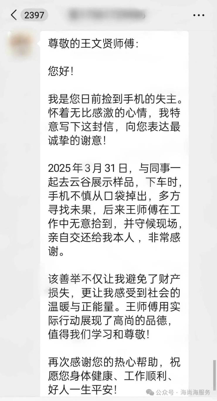 失主感激不尽,特意通过微信给王文贤发来一封表扬信,称这一善举不仅让他避免了财产损失,更让他感受到社会的温暖与正能量。面对失主的感谢,她朴实地说:"这是应该做的。" 平凡的岗位,不平凡的善举,王文贤用实际行动展现了物业人的诚信与担当。她的故事虽小,却如春风般温暖了整个园区。