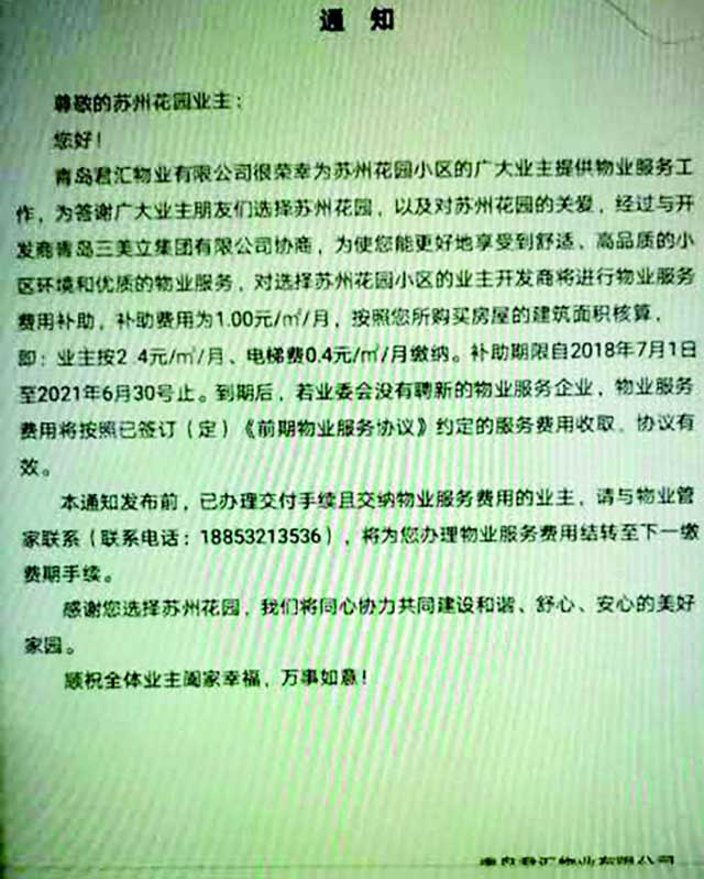 “或许他们感到了压力,青岛君汇物业有限公司在8月8日发了一个告业主的通知。”小林告诉记者,青岛君汇物业有限公司在通知中写道:“为答谢广大业主朋友们选择苏州花园,以及对苏州花园的关爱,经过与开发商青岛三美立集团有限公司协商,为使您能更好地享受到舒适、高品质的小区环境和优质的物业服务,对选择苏州花园小区的业主开发商将进行物业服务费用补助,补助费用为1.00元/㎡/月,按照您所购买房屋的建筑面积核算,即:业主按2 .4元/㎡/月、电梯费0.4元/㎡/月缴纳。补助期限自2018年7月1日至2021年6月30号止。到期后,若业委会没有聘新的物业服务企业,物业服务费用将按照已签订(定)《前期物业服务协议》约定的服务费用收取,协议有效。本通知发布前,已办理交付手续且交纳物业服务费用的业主,请与物业管家联系(联系电话:18853213536),将为您办理物业服务费用结转至下一缴费期手续。”