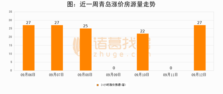 根据诸葛找房数据显示,青岛24小时涨价房源量为27套,较09月11日增加27套,环比上涨0%。与此同时,涨价房源占比小幅扩大,业主信心有所提升。