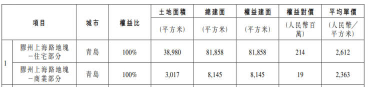 其中青岛青岛地块位于胶州上海路,含住宅和商业两部分,权益比均为100%,住宅部分土地面积38980平方米,总建面81858平方米,平均单价为2612远/平方米;商业部分土地面积3017平方米,总建面8145平方米,平均单价为2363元/平方米。