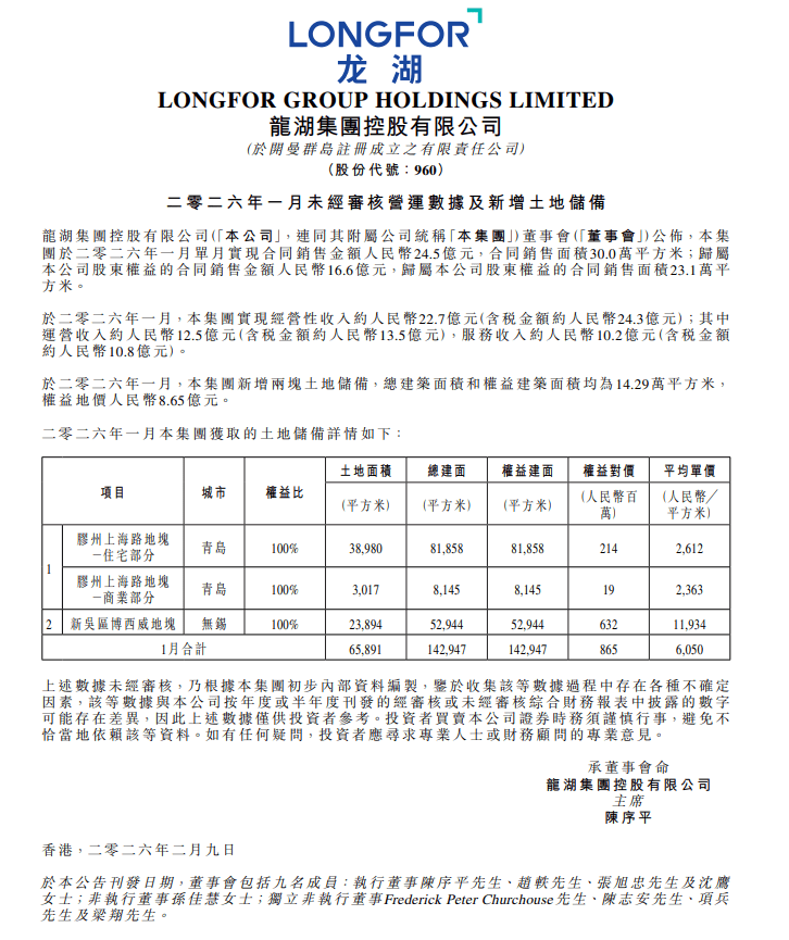 2月9日,龙湖集团控股有限公司发布2026年1月未经审核营运数据及新增土地储备公告。