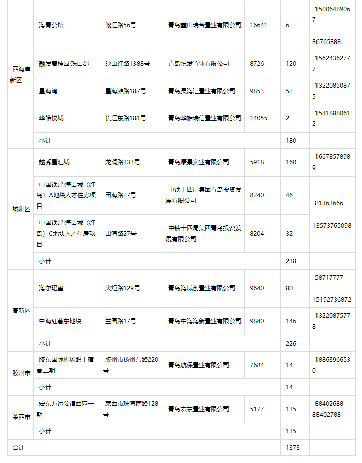 青岛发布最新市级统筹产权型人才住房项目情况表 共计1373套房源