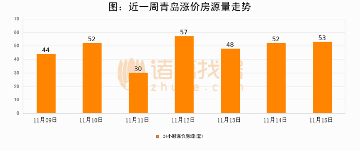根据诸葛找房数据显示,青岛24小时涨价房源量为53套,较11月14日增加1套,环比上涨1.9%。与此同时,涨价房源占比小幅扩大,业主信心有所提升。