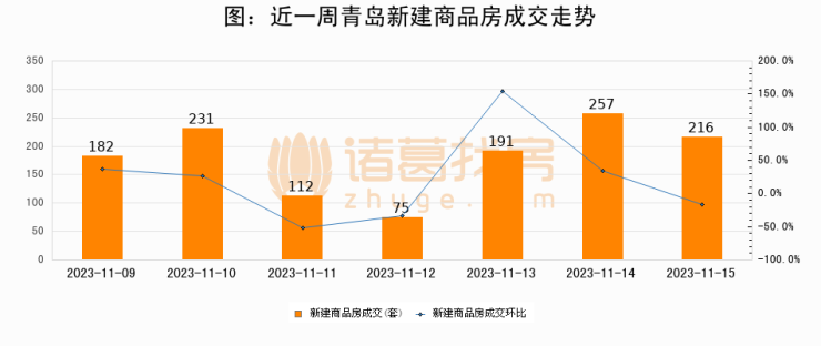 根据青岛市住房和城乡建设局数据显示,2023年11月15日青岛新建商品房成交216套,较昨日减少41套,环比下降16%