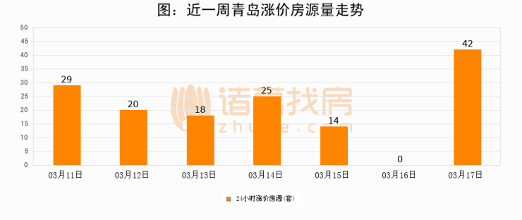 根据诸葛找房数据显示,青岛24小时涨价房源量为42套,较03月16日增加42套,环比上涨0%。与此同时,涨价房源占比小幅扩大,业主信心有所提升。