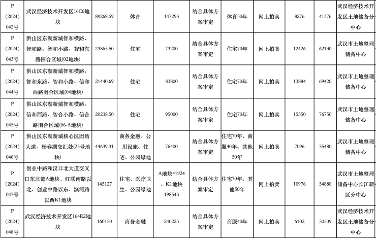 土地面积最大的是P(2024)047号地块,为创业中路和汉口北大道交叉口东北部A地块,红联南路以北、创业中路以东、滨河路以西K1地块,土地性质包括住宅、医疗卫生、公园绿地,土地面积145127平方米,起始总价5.488亿元。