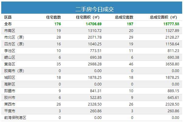 2日全市二手房成197套,总成交面积15777.58㎡,包括住宅176套,成交面积14706.69㎡。(图为各区市住宅交易量数据)