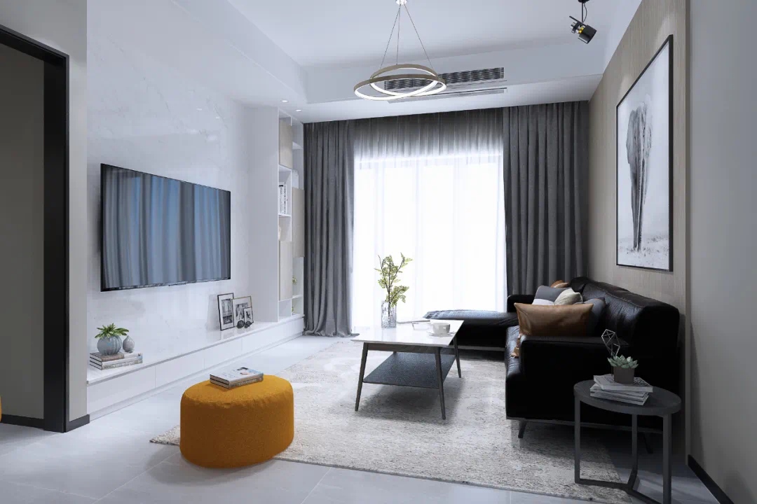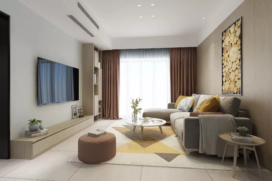 方案2是靠沙发墙或电视墙一侧做吊顶,把中央空调装在一侧的背景墙上,这样可以让空间显得更加宽长,也是实用的方案。