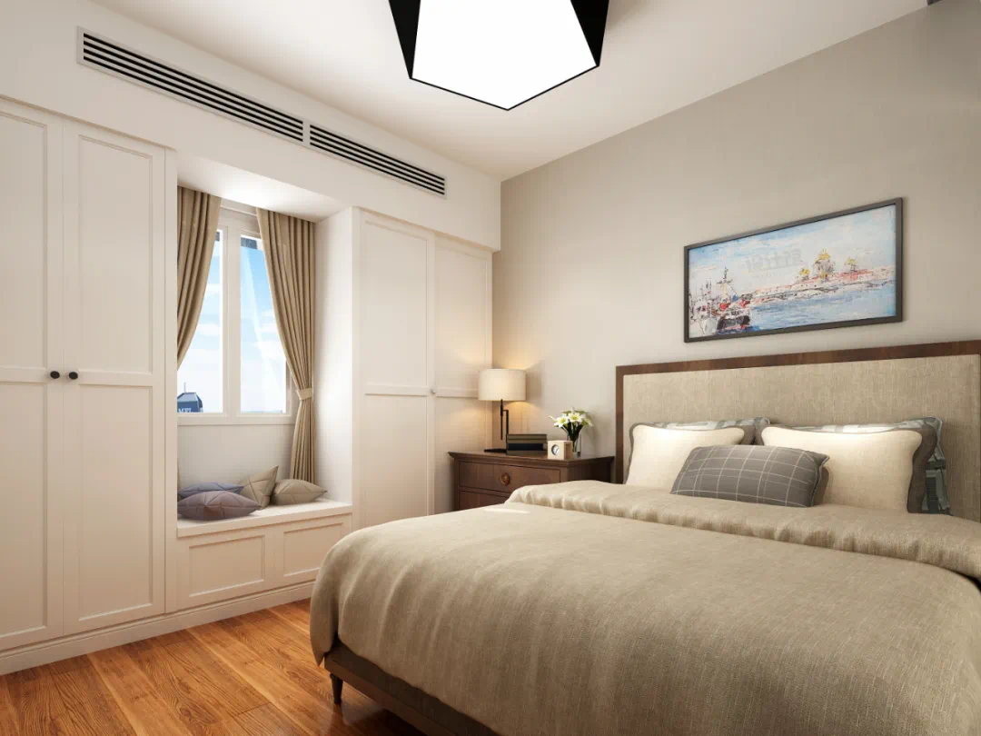 因此很多家庭装修的空调方案,就是大厅中央空调+卧室壁挂空调的组合。当然,如果你装修预算充足,也是可以考虑全屋中央空调的方案的。关于与中央空调组合的吊顶方案,以上介绍的方案也可以引用到卧室空间里,各位可以参考借鉴一下。此外,卧室的中央空调,可以以“侧出侧回”的安装方式,装在衣柜上方。